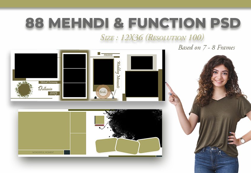 Designed for today’s wedding photographers, this Mehndi album PSD (88 Sheets ) includes mixed frame orientations — perfect for close-up Mehndi designs and candid family moments. The white and light green background enhances every photo beautifully.